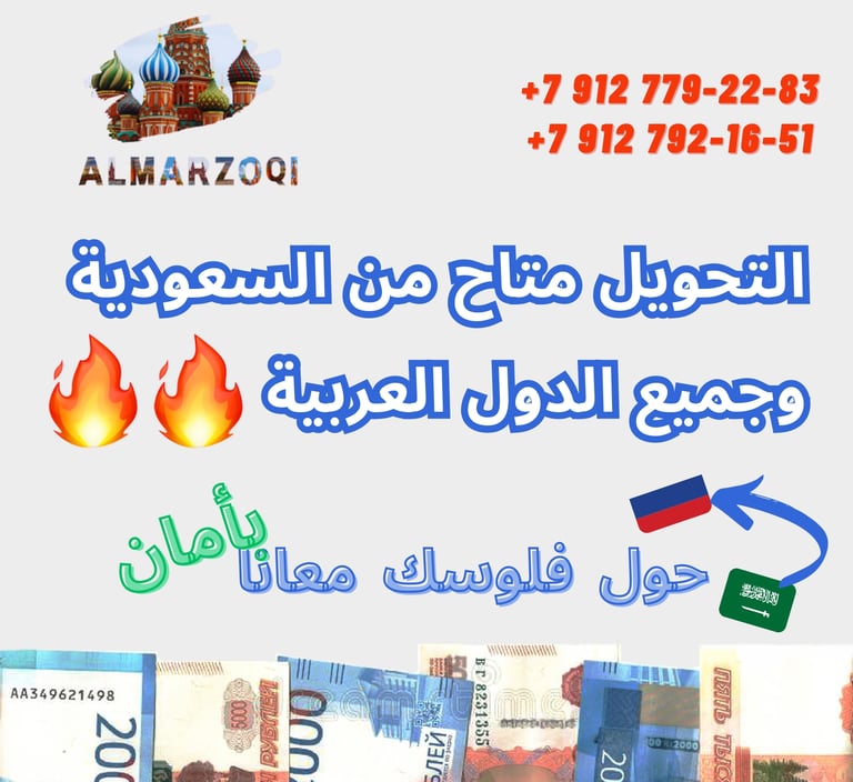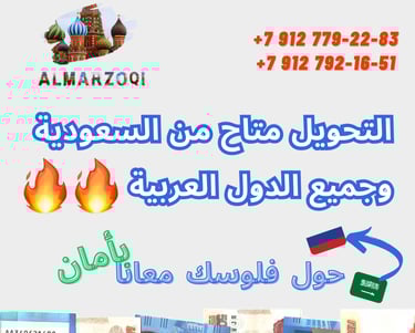 نحن نقدم لك خدمة تحويل الأموال من الدول العربية إلى روسيا بطريقة سهلة وآمنة. يمكنك الاعتماد علينا لتحويل أموالك بدقة وسرعة، حيث نتبع أعلى معايير الأمان والجودة في خدماتنا. سواء كنت ترغب في تحويل أموال لأحد أفراد عائلتك أو تجارياً، فنحن نوفر لك الخدمة المثالية لتبسيط معاملاتك المالية. اتصل بنا الآن للحصول على خدمات موثوقة وسهلة لتحويل أموالك بين الدول العربية وروسيا